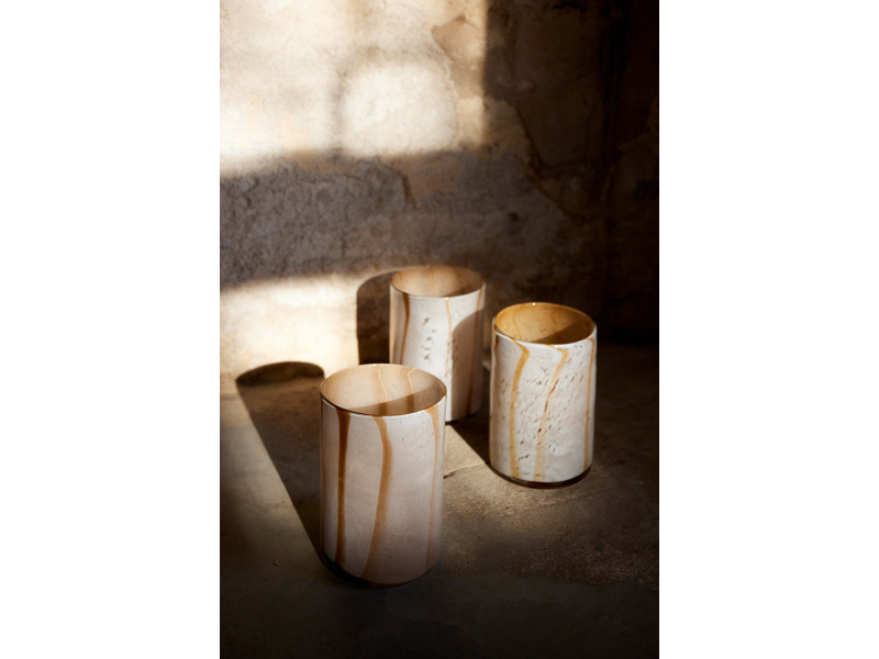 Denna stilfulla ljuslykta i glas har ett vackert mönster i varma bruna och beige toner som skapar en harmonisk och naturlig känsla. Det skimrande glaset sprider ett behagligt ljus som ger rummet en lugn och inbjudande atmosfär. Perfekt för att skapa stämning på middagsbordet, i fönstret eller på en bricka tillsammans med andra ljuslyktor.